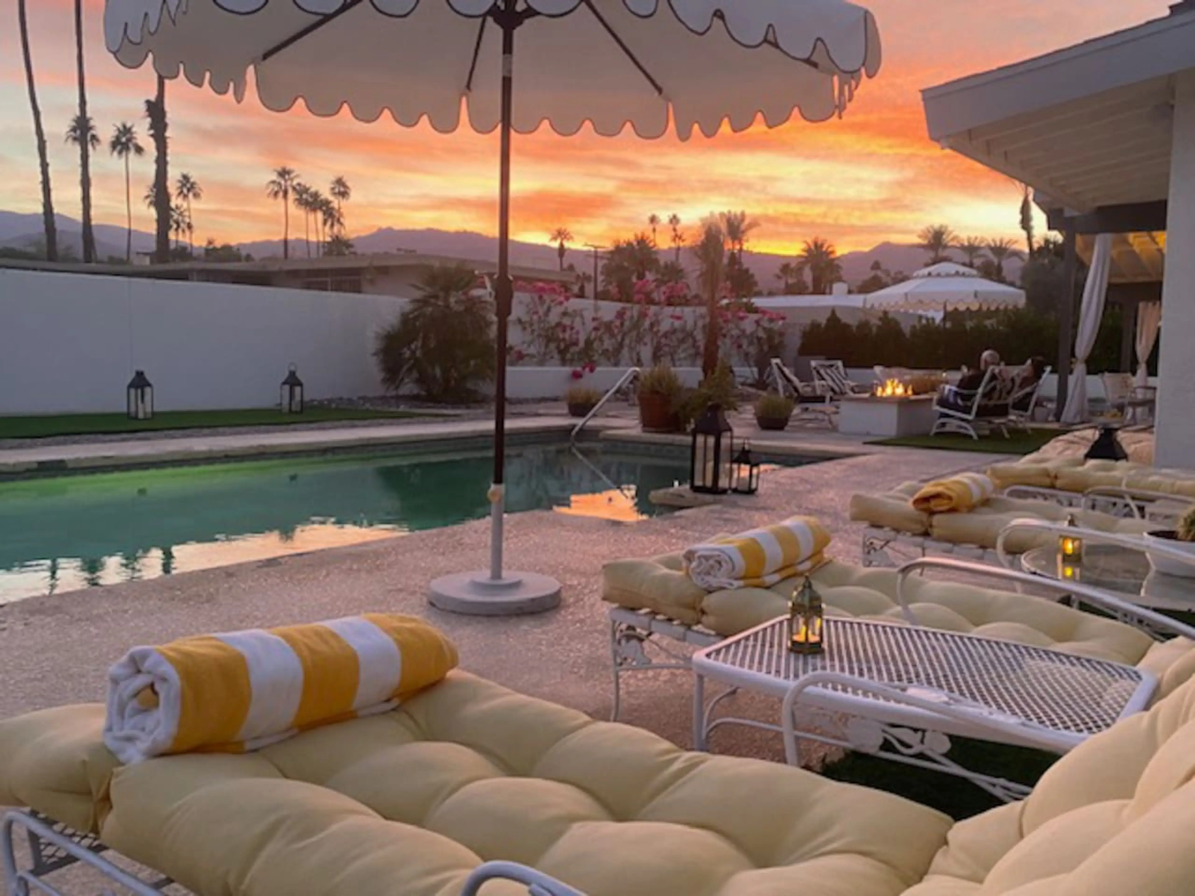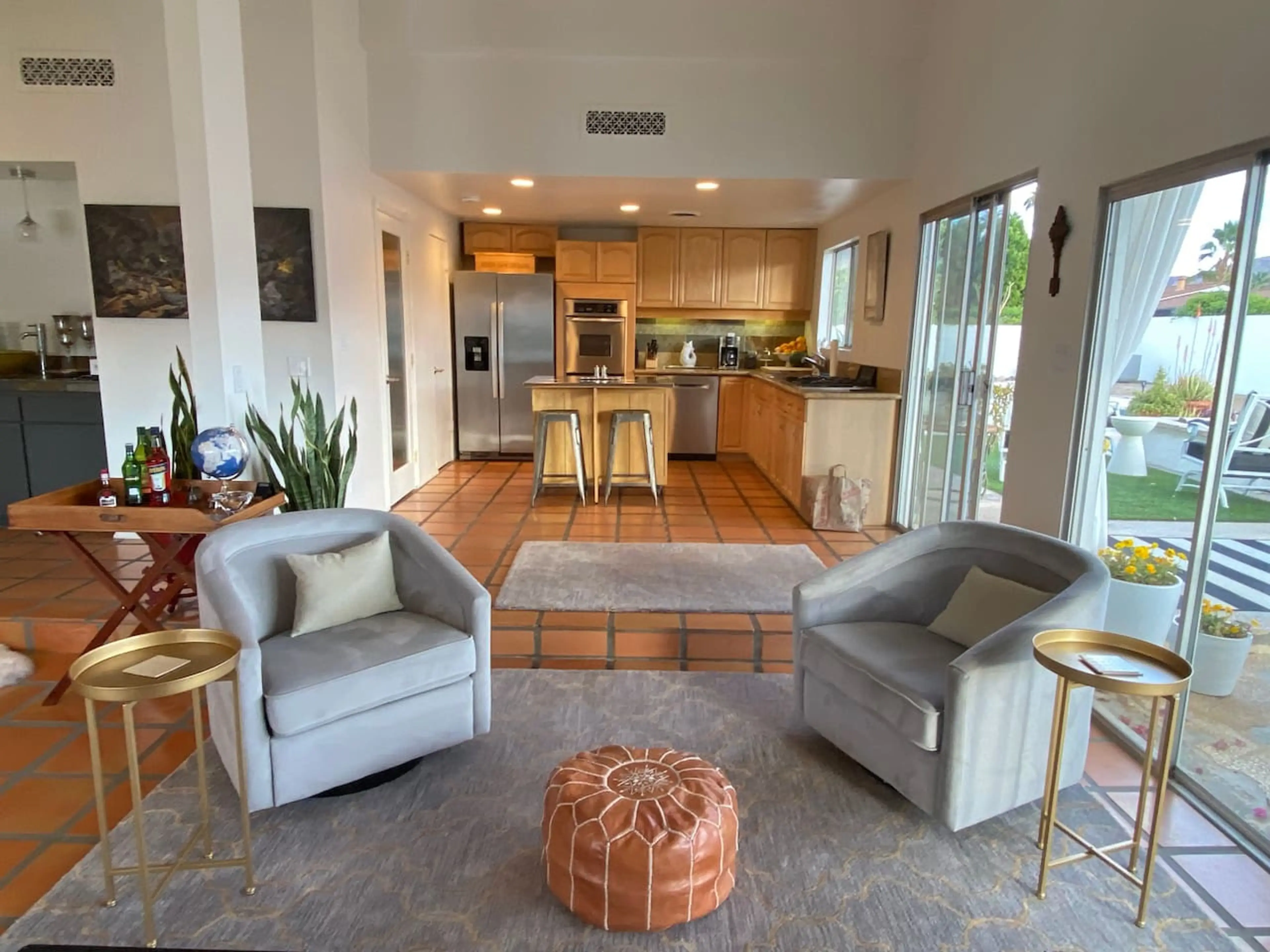 Mid-century desert pool home (1972 model) with 180° mountain views. Sunken living, dining & bar areas, fully stocked kitchen, Bose outdoor speakers. South-facing yard with pool, cabana dining, yoga lawn & multiple seating areas. Walk to El Paseo & cafes. Sleeps 6: 2 king rooms + twin/office. Garage,...